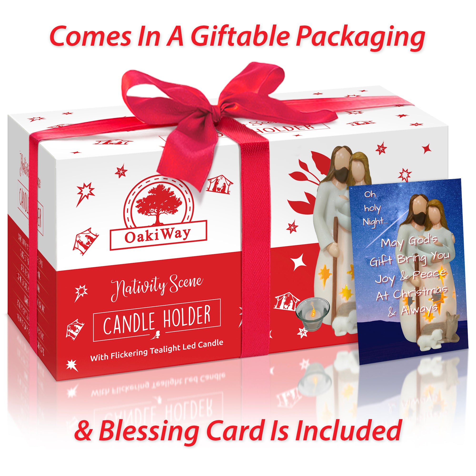 - π FLICKERING LED CANDLE & GIFT PACKING INCLUDED - It includes a flickering LED candle, collectible gift package boxing, and a matching Christmas card. Whether purchased as a gift or for yourself, this flickering nativity candle will beautifully display baby Jesus and bring joy to your to any space.