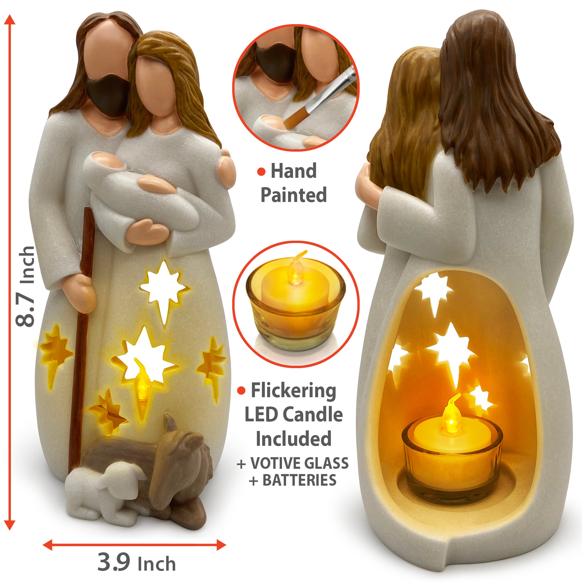 - πTHE BEST ADDITION TO LIGHT UP YOUR HOME THIS CHRISTMAS - Our hand-painted, candle holder nativity set is Bright and calming, this Holy Family figurines - Joseph, Maria & Baby Jesus with the donkey and the sheep, will display a beautiful reminder of the reason for the holiday season, which everyone is wish displaying on their Christmas window.