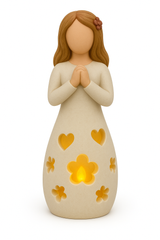 Express your gratitude with this beautifully hand painted candle holder figurine. Designed in our signature minimalist style, the “Thank You” Girl holds a bright red heart as a symbol of appreciation, while soft heart-shaped cutouts on her dress glow gently with the included LED candle.