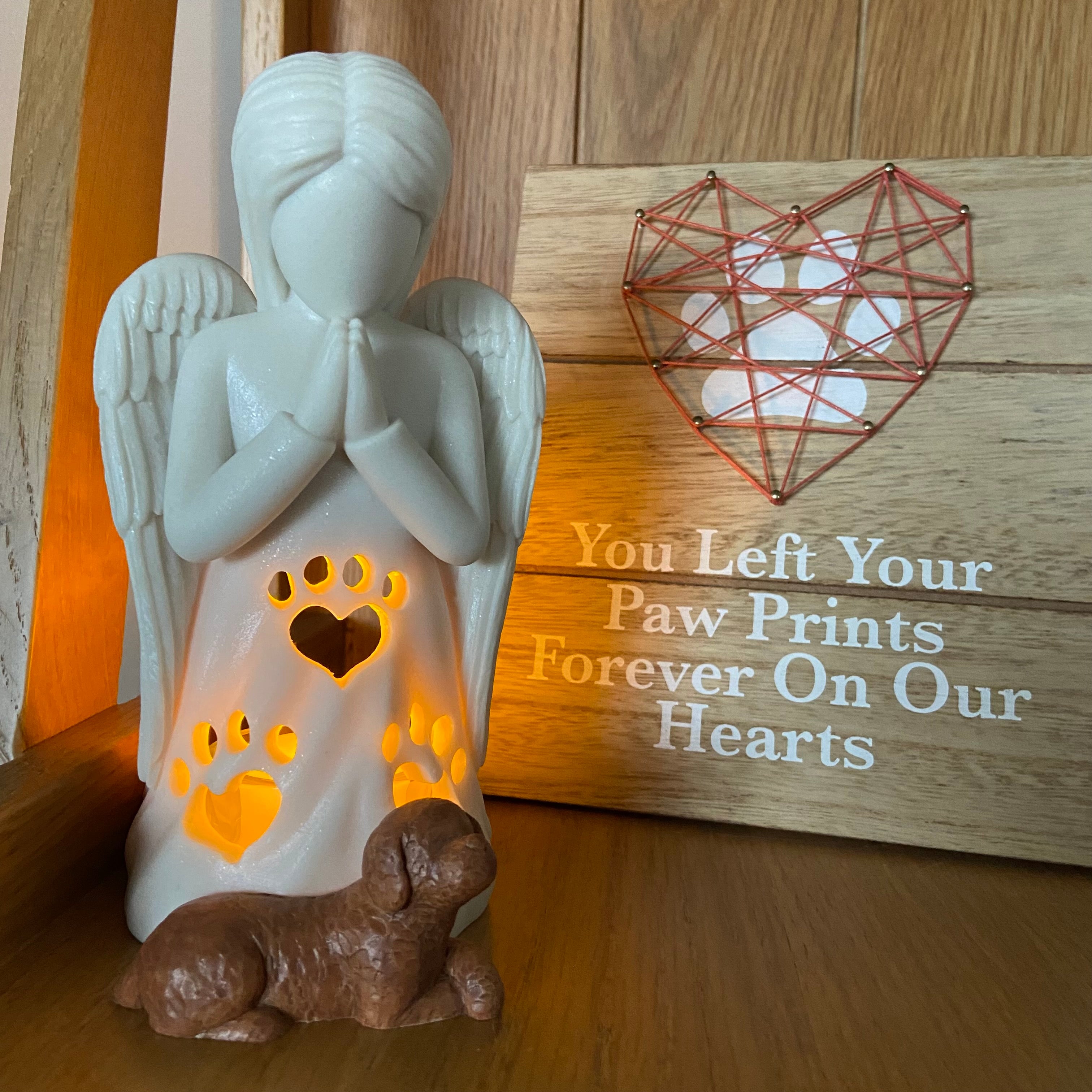 • HIGH QUALITY & SUPER MEANEANGFUL GIFT – This dog sympathy gift angel figurine is made of high quality polished Polyresin material, which has a smooth stone look and feel. A beautiful guardian angel in a praying position for a dog, with Pawprints holes in the angel's body, designed especially for the candle light that comes with it, to go through and create a peaceful and relaxing enviourment.