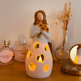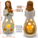 - ☀️The statue is hand-painted making it a special art piece with a perfect feel and touch. The flickering LED candle shines through the girl's dress heart and flower holes, it glows artificial light, creating a calm & relaxing environment, for repeatable and safe use (A regular tealight can be used as well) .It will fit into most spaces, tables, and shelves, It measures 7 Inch high and 3.9 Inch wide.